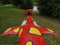 Die farbenfrohen Skulpturen von Marion Quitz mit ihren ausladend sinnlichen Formen akzentuieren die Uferzone in auffallender Weise. Ein mythisch anmutender Zug amphibischer Gestalten, auf der Suche nach einem neuen Paradies, die noch nicht entschieden haben, ob sie vom Wasser wegziehen oder dorthin zurückkehren. Dabei wechselt das reale Sujet über das Märchenhaft-Fantastische in den Bereich der subjektiven Fantasie. Immerhin könnten die mit mehreren Schichten Zeitungspapier beklebten, wassserdicht isolierten und schließlich in leuchtenden Rottönen bemalten Drahtkonstruktionen auch gute Geister sein. Dieser Eindruck verstärkt sich noch in den Abendstunden, wenn durch gespeicherte Solarenergie die Fische von innen heraus zu leuchten beginnen, und die Gruppe ein geheimnisvolles Eigenleben in der Landschaft entfaltet. Im Wechselspiel von Wieder-Erkennung und Verfremdung, von intuitiver emotionaler Gestaltung und ethisch-moralischem Anliegen werden hier neue Überlebensweisen trainiert, während die Künstlerin die verloren gegangene Harmonie der Schöpfung reklamiert. Der große Fischzug will unser Auge nicht nur erfreuen, er will uns vielmehr sensibilisieren für die Notwendigkeit, mit unseren Gewässern verantwortungsvoller umzugehen, wenn uns Artenvielfalt und Lebensqualität der Kreatur wirklich etwas bedeuten. |